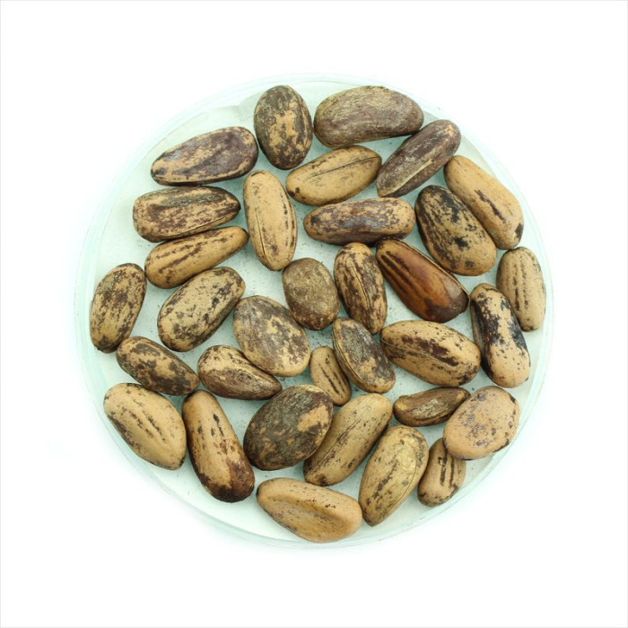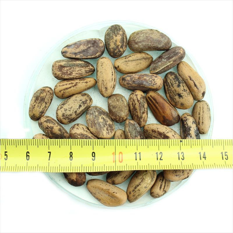 Seeds are elongated-oval, dark brown with light spots, three-ribbed, 15–17 mm long and 8–9 mm wide, with a thick shell and a short narrow wing. They are edible and the largest among all pine species—3–4 times bigger than the "cedar nuts" known in Eastern Europe. One kilogram contains about 1,500 seeds. Yields are high: 3–8 tons per hectare. In Italy, they’re called "pignoli."