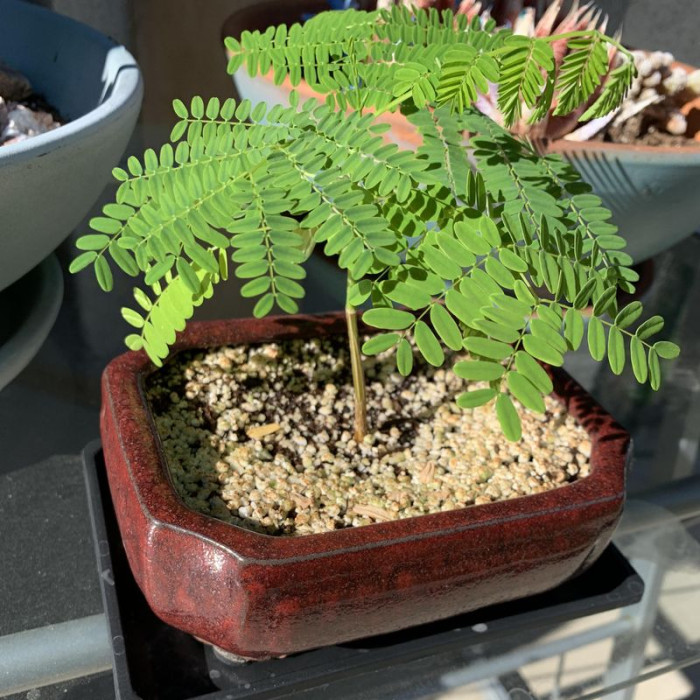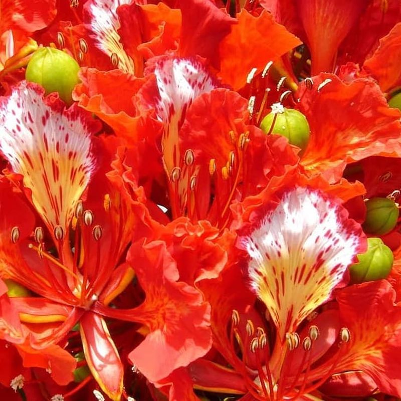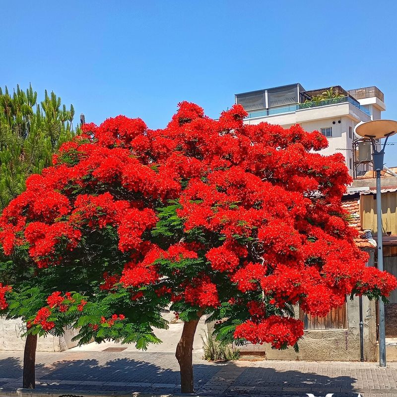 Flamboyant Tree or Royal Poinciana / Delonix regia - this semi-evergreen tree grows up to 10 meters tall, with a wide umbrella-like crown. Its elegant bright green bipinnate leaves, 30–50 cm long, fold at night.