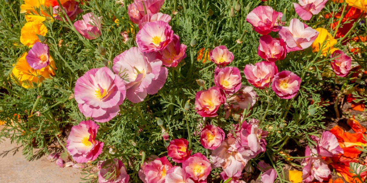 Eschscholzia californica is an elegant perennial herbaceous plant with a straight thin stem and delicate foliage. Large cup-shaped flowers, reaching 8–9 cm in diameter, stand out in the flower bed thanks to rich yellow, orange, and carmine shades of petals. There are also varieties with delicate cream and fancy bicolor coloring. Flowering lasts from early summer to mid-autumn.