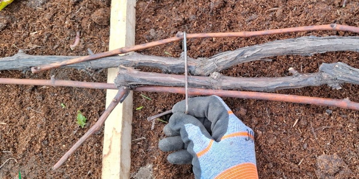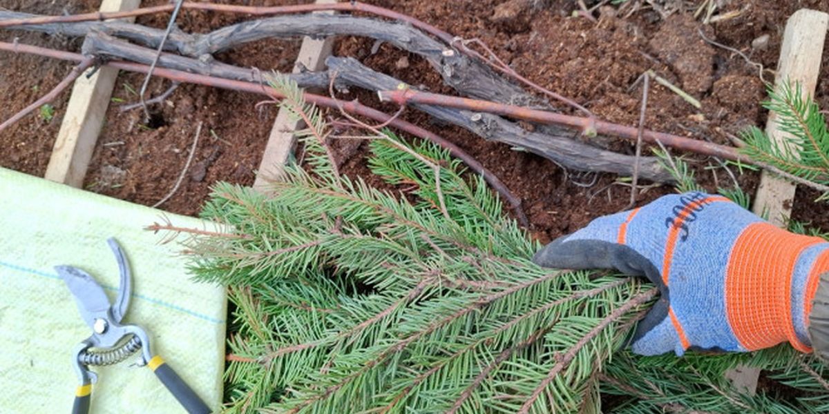 To prevent vines and arms from touching the soil surface and getting wet during thaws, you can place small blocks or spruce branches under the shoots. This helps prevent mold formation on the vineyard. Shoots laid on blocks can be fixed with bent rebar or staples for securing agrofabric.