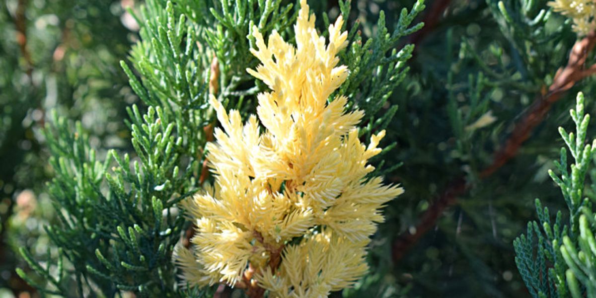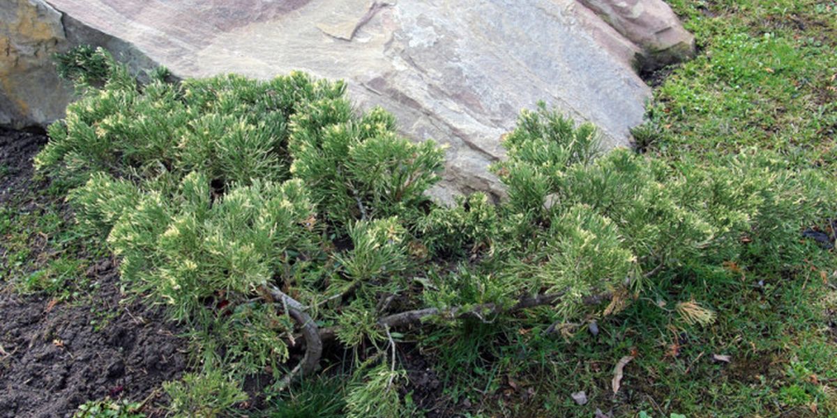 - Juniperus sabina ‘Variegata’ – a low, spreading evergreen shrub with a dense creeping crown. The foliage is gray-green, and new growth is creamy white.