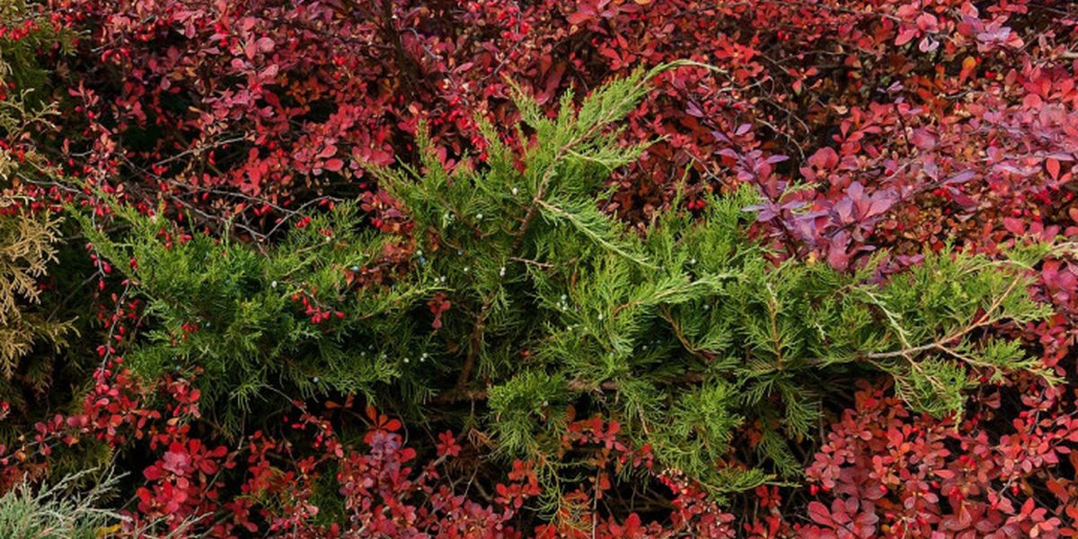 Juniper’s green “pillows” look especially striking in spring during the lush bloom of deciduous neighbors or in autumn when their foliage turns golden, orange, purple, or crimson.