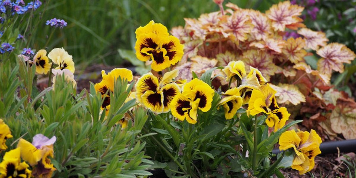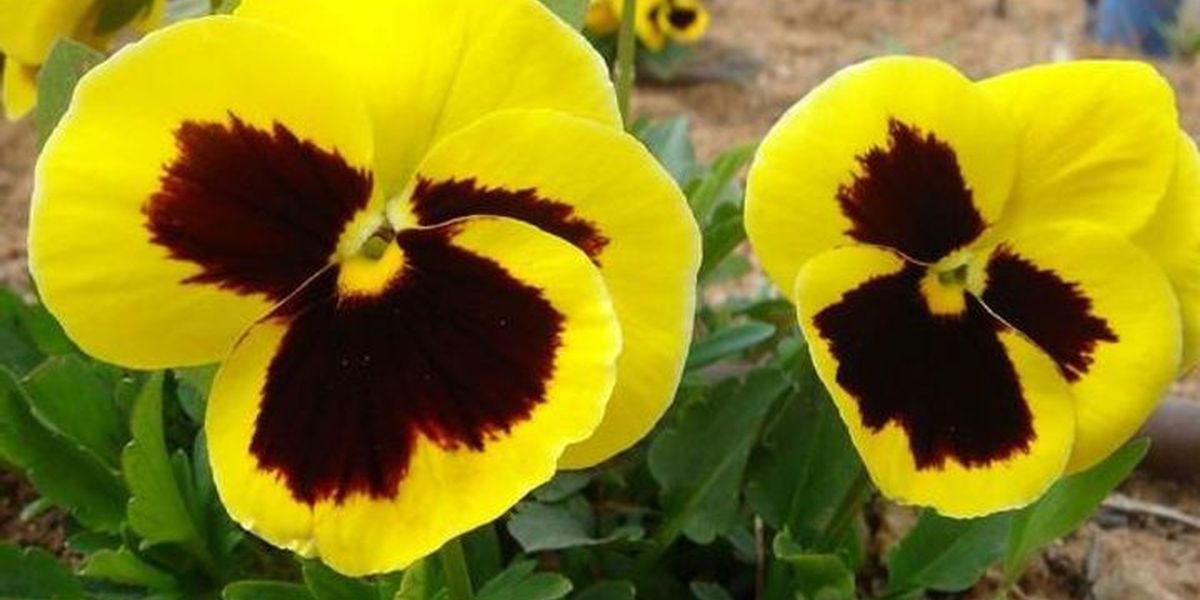 Віола (фіалка) «Біколор» / Viola wittrockiana - це дворічна рослина, висотою 15-20 см. Квітки великі, діаметром 6-7 см, жовтого забарвлення з коричневим краєм.